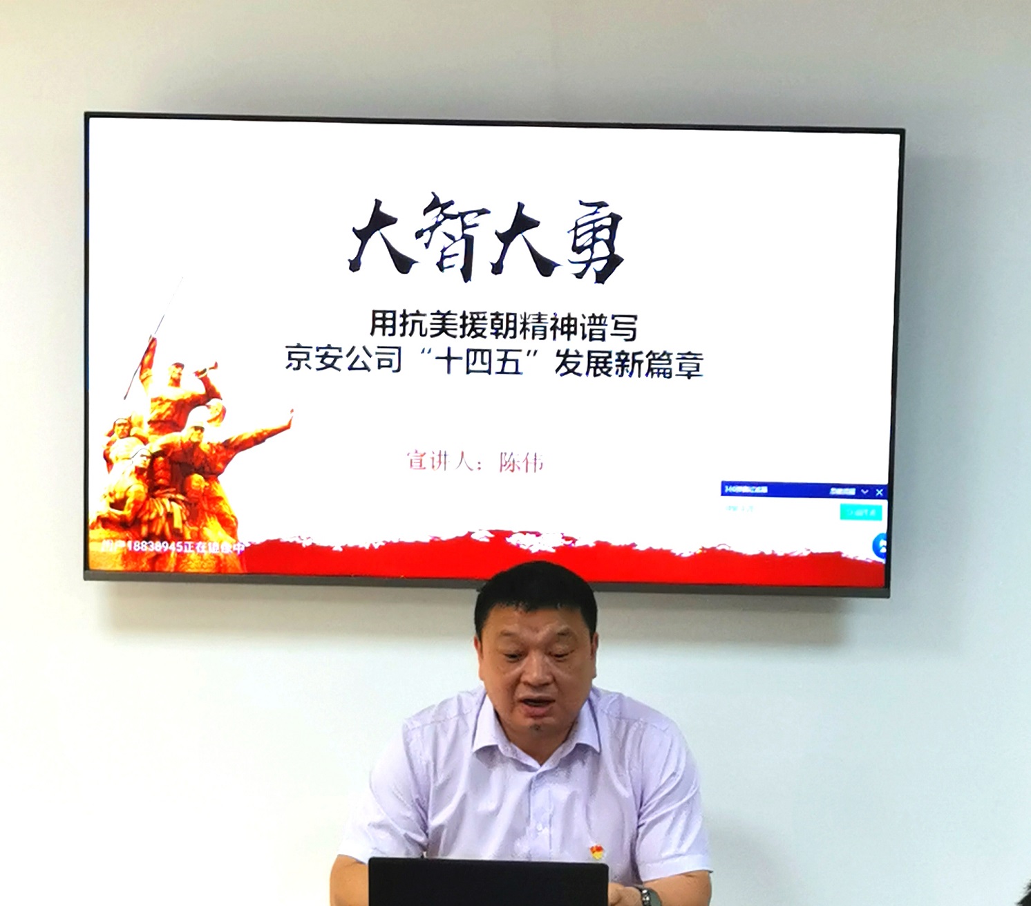 陳偉同志在題為《大智大勇 用抗美援朝精神譜寫京安公司“十四五”發展新篇章》的黨課中,回顧了上世紀50年代中國人民志愿軍在客觀條件十分艱苦的情況下,不畏強敵、藐視困難,大智大勇,奪取勝利的偉大歷史。提出“大智大勇、敢于勝利”不僅是志愿軍的軍魂,同樣也應該是京安的企業之魂,要用這種精氣神去克服前進中的困難挑戰,奮力完成年度重點工作。