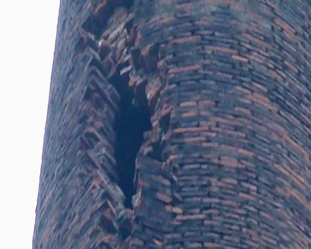 該煙囪位于富陽市新登鎮銀泰機械鑄造廠區內,系原磚瓦廠取締后遺留,一直未妥善處理。今年3月初因遭雷擊后煙囪出現了巨大的縱向裂縫,隨時有倒塌危險。該煙囪距北側廠房僅0.2米,距東側廠房約8米,給鑄造廠安全生產帶來極大安全隱患,3月9日廠區因此全面停產。