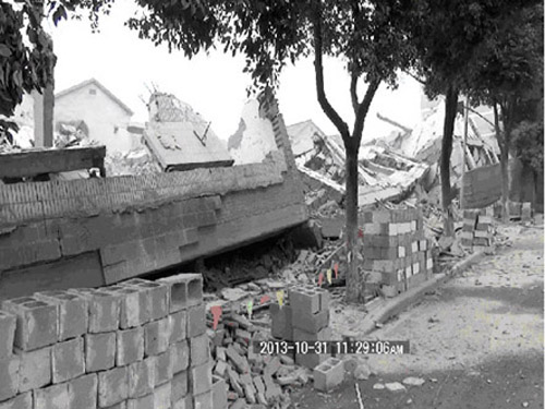 為配合推動德清縣三改一拆工作順利進行,浙江物產京安爆破工程有限公司組織了強有力的施工隊伍,精心設計,嚴密施工。為確保爆破效果和爆破作業安全,設計方案中采用了毫秒延期技術,使大樓爆破后逐棟逐排逐跨分段延期觸地,既有助于樓體傾倒觸地后的充分解體,也極大的降低了塌落震動影響。同時,在精確控制藥量的基礎上,對爆體采用包裹防護及隔離防護,以上措施將有效控制爆破飛石危害,以確保安全。爆破后,4幢樓背離英溪北路逐棟向正西方向傾倒,爆堆最大高度約4m,前方傾出約8m,基本無后座,英溪北路在第一時間恢復了交通,爆破結果近乎完美。本次爆破共使用了乳化炸藥168kg,各段別非電毫秒雷管5500發,傳爆用導爆管5000m。爆破設計方案由核工業井巷建設公司評估,浙江高能爆破工程有限公司負責現場監理。