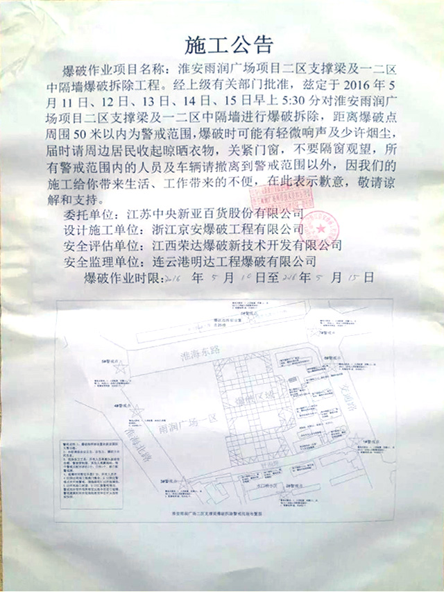 5月11日-5月15日,每天早上5:00-5:30,位于淮安核心商業(yè)地段淮海廣場(chǎng)商業(yè)區(qū)東南片區(qū)的雨潤(rùn)廣場(chǎng)總會(huì)傳來(lái)一陣緊促的鞭炮般的響聲,這不是開業(yè)慶典,這是爆破的聲音。