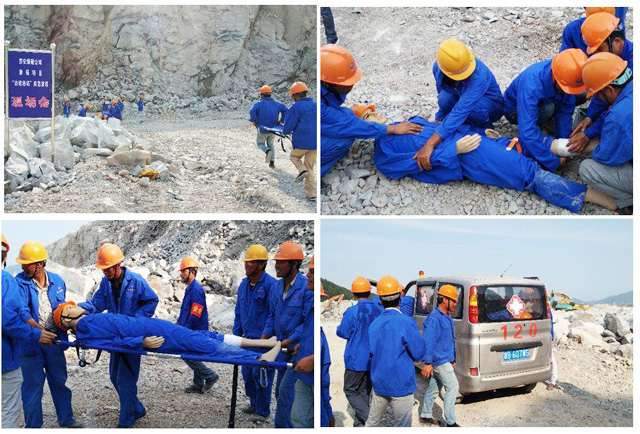 為了使演練更加貼近實戰,能夠直觀演示救援環節,項目部在+20平臺模擬設計了邊坡局部坍塌,現場安全員發現一名施工人員(假人)被掩埋,警報驟響,項目部立即啟動事故應急救援預案,迅速組織力量自救,同時向業主和地方政府報告事故情況,并聯系醫院實施救援。在救援總指揮的指揮下,各救援小組火速集結,分工明確、行動有序;安全保衛組立即封鎖道路和事故區域,設置警戒線,疏導交通;技術保障組立即進入事故現場查看險情,對邊坡塌方區域進行監控、分析和觀測;后勤保障組立即組織救援設備、物資奔赴現場;醫療救護組攜帶醫療救護設備隨時待命,準備救治傷員;搶險救援組火速進入事故現場開展救援,組織挖機、裝載機清理邊緣土石方,再進行人工清渣,被困傷員被成功救出;待命已久的醫療救護組對立即傷員進行必要的止血、包扎、固定等處理后,立即將傷員抬上擔架,送上“救護車”,前往“醫院”接受救治。整個救援過程銜接緊密,為搶救傷員贏得了寶貴時間。